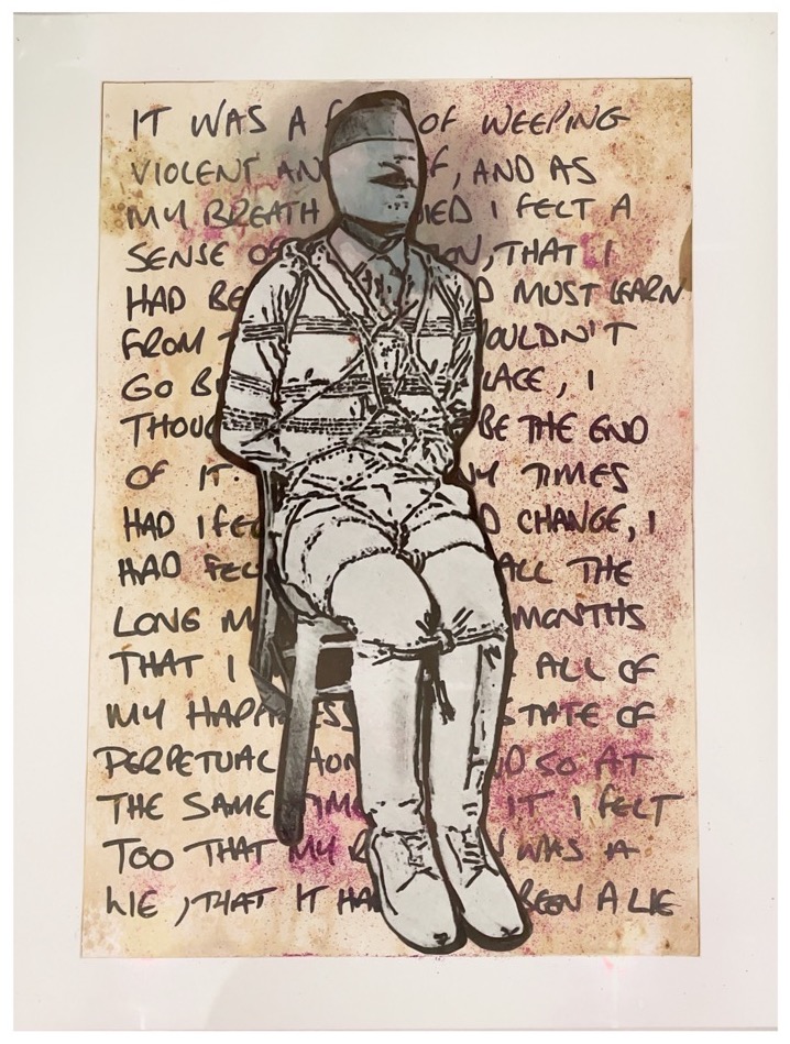 All of these portraits were created as draft experiments, and where the author of the materials is still alive I approached them for approval for inclusion retrospectively – but with great success, each sharing the work on their social media channels. This in turn led to my first fully informed collaboration with writer Garth Greenwell, author of Cleanness and the adult film star Joel Someone. The result being JOEL/GREENWELL: Mar 22 (in blood, cum, sharpie, piss, glitter, PrEP) which is in many ways, our queer response to Tracey Emin’s ‘I Am The Last of My Kind’.