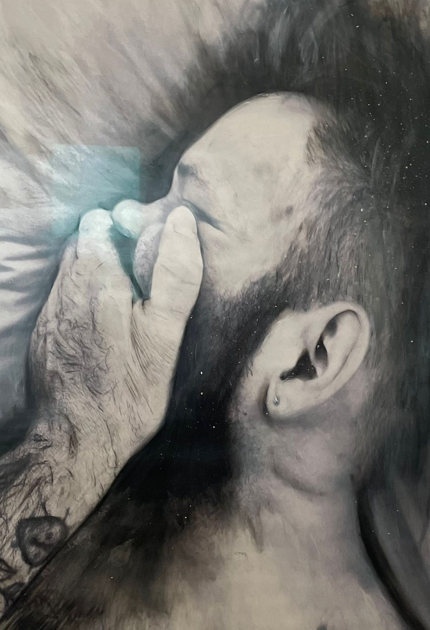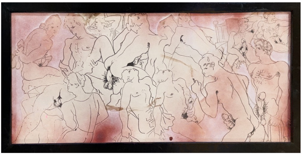 Since late 2021, I have been developing a collaborative practice with models and authors to experiment in the creation of paintings made using my own bodily fluids (and that of the some models) as well as more conventional materials. Originally inspired by the weaponisation of the queer man’s blood and semen through the AIDS crisis, my visual work has in the past taken inspiration from other queer artists, sometimes bastardising their sketches, sometimes creating collages of their work, but always incorporating my blood into the images.